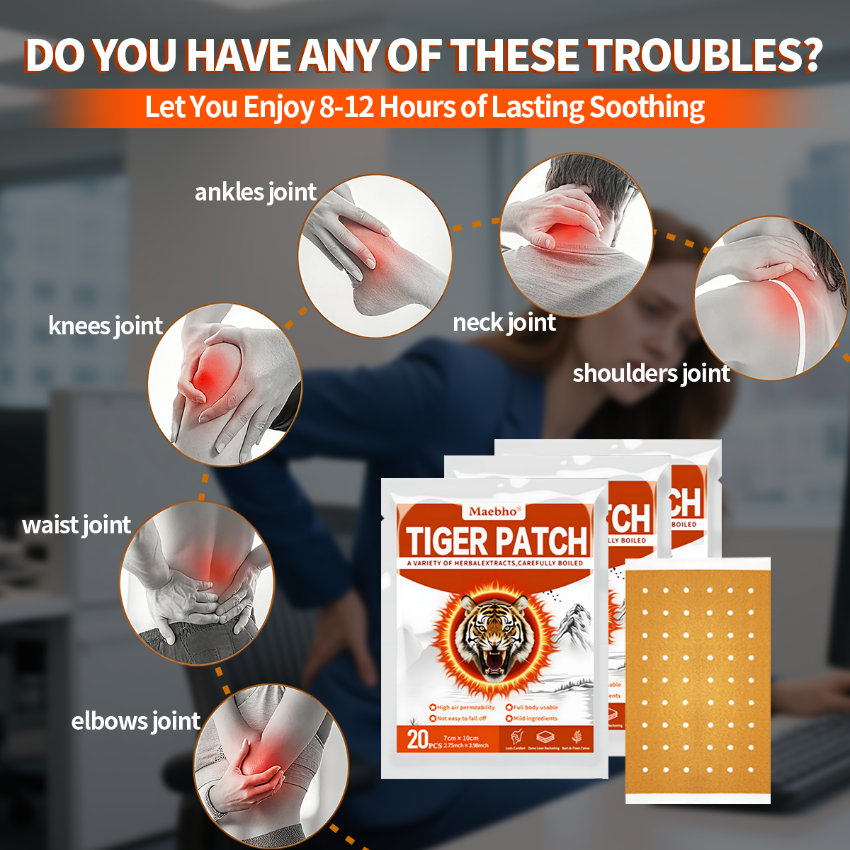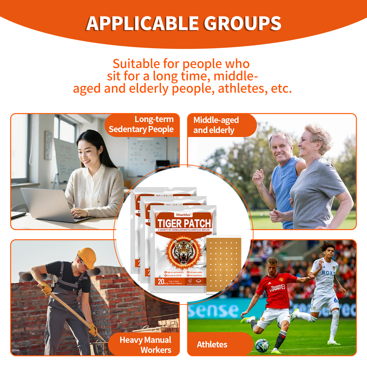 - Tiger heat knee patches Ideal for sedentary workers, standing professionals, the middle-aged, elderly, heavy laborers, and athletes.