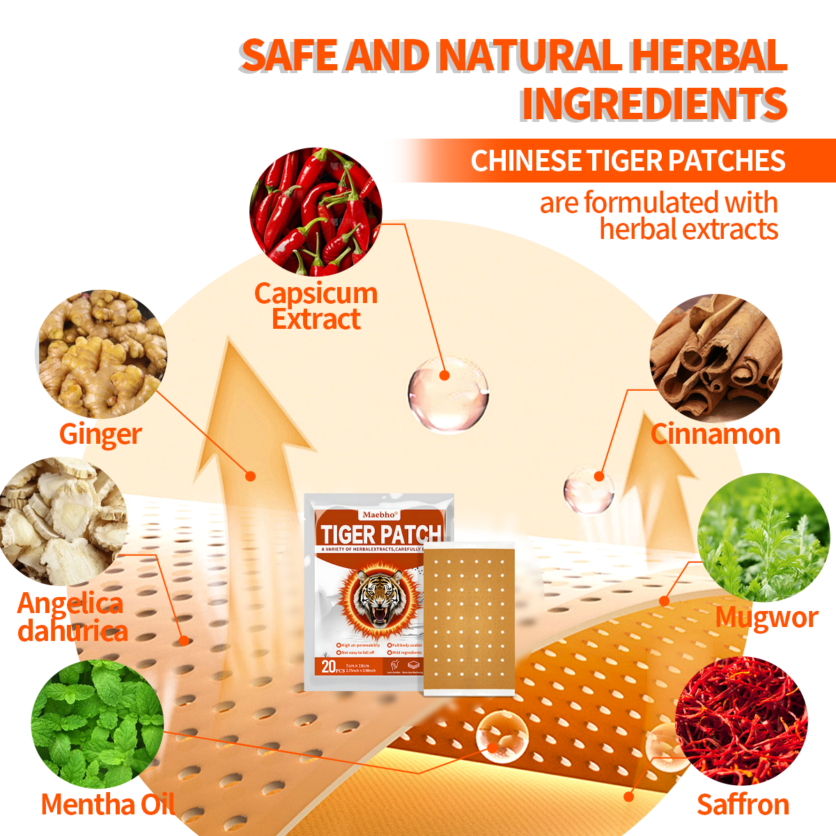 - Chinese Tiger patches are made from herbal extracts, designed to relieve muscle and joint pain (knees, shoulders, neck) by improving blood circulation.